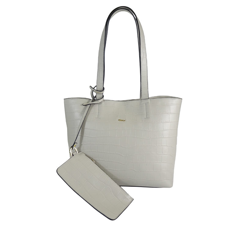 Description: Embossed Leather Tote With Back Zip Pocket, Interior Zip And Slip Pockets. Detachable Zipper Cosmetic Pouch.